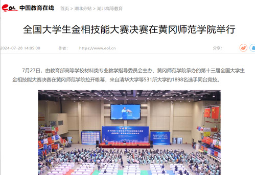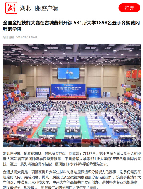 7月25日至30日,第十三届全国大学生金相技能大赛决赛在我校举行,来自清华大学等531所大学的1898名选手同台竞技。该大赛是材料类专业规格最高、制度最健全、规模最大、影响最广泛的全国性大学生学科赛事,受到媒体广泛关注,新华社、光明日报、中央广电总台国际在线、中国教育报、中国青年报、中新网、中华网、高校之窗、中国教育在线、新浪新闻、网易新闻、湖北日报、极目新闻、长江云、荆楚网、黄冈日报等众多主流媒体对大赛盛况进行了专门报道。
